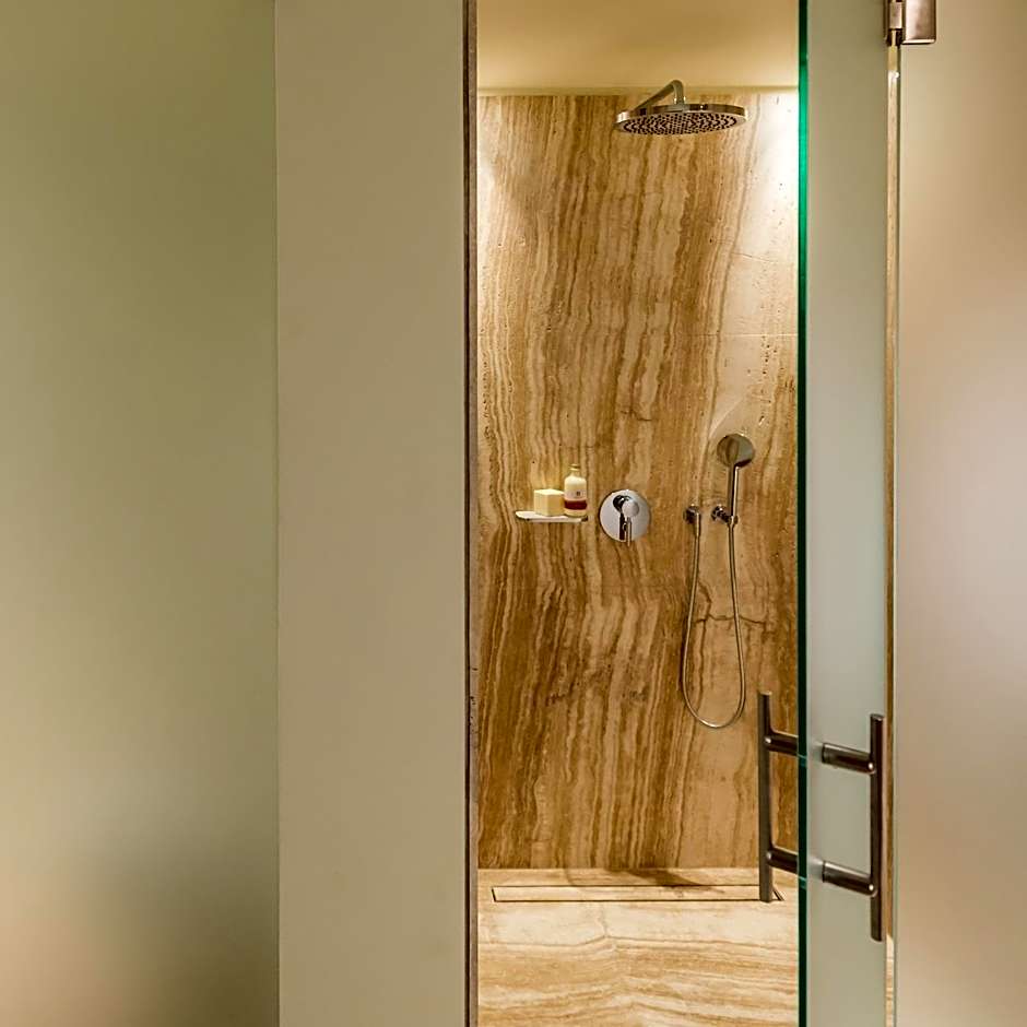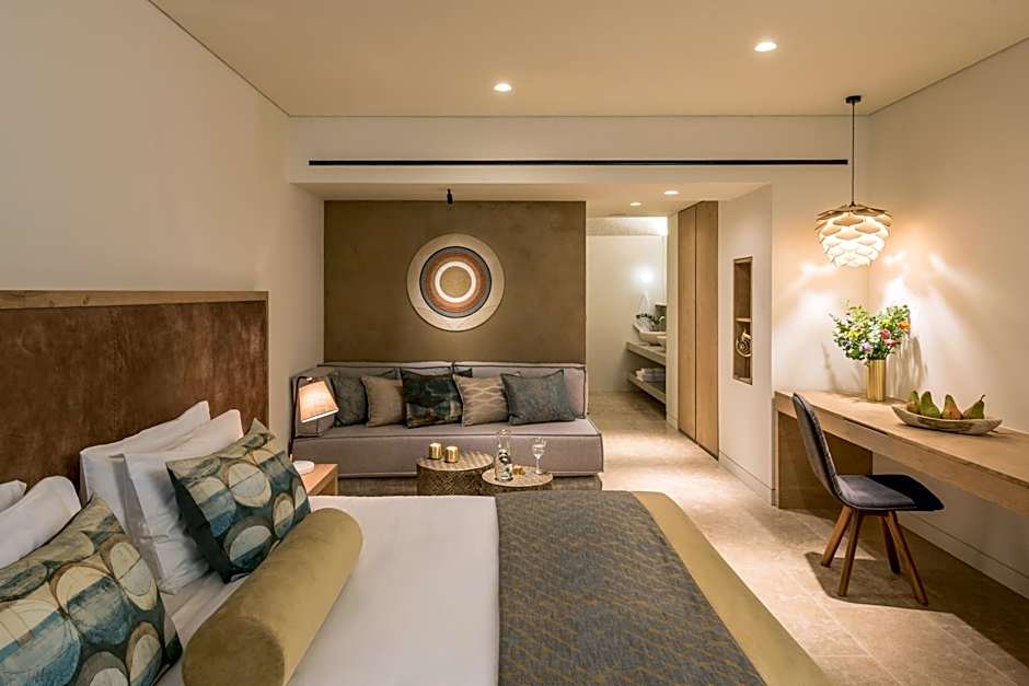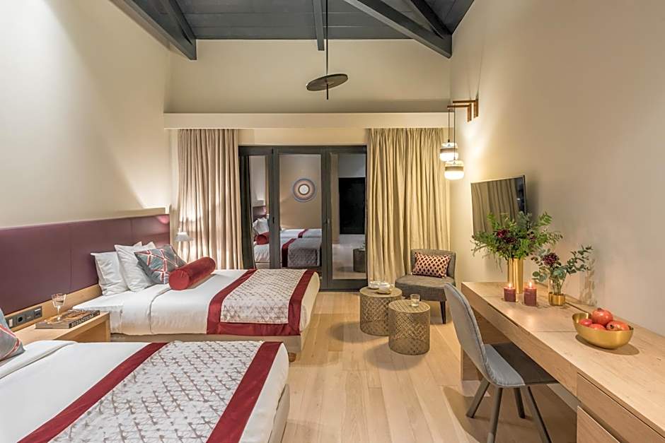 Covering an area of 55 to 67 m2, Mystras Suite is fitted with designer furniture, unique textiles and warm colors. The spacious and elegant Mystras Suites have a separate bedroom with 2 large twin beds or a king size bed, a seating area and a luxurious onyx marble bathroom featuring a custom steam shower. Each opens to a private terrace with direct view to the citrus valley and the traditional village of Mystras. Special amenities and services include: • flower arrangement upon arrival • exclusive Euphoria Retreat SPA bathroom amenities • body splash aroma.