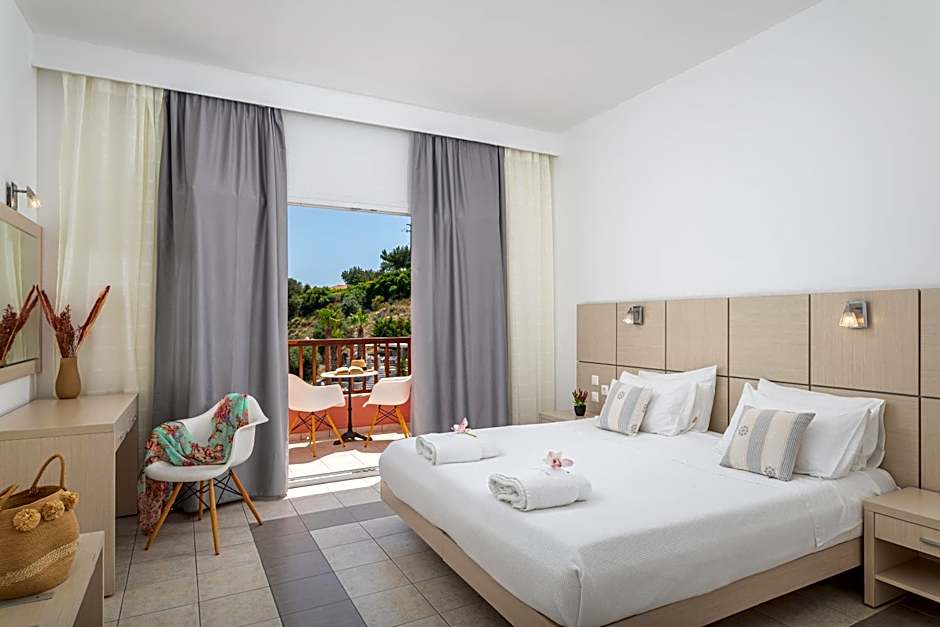 Light and airy room with flat-screen satellite TV, air conditioning and a fridge. Offers furnished balcony with views of the Aegean Sea.