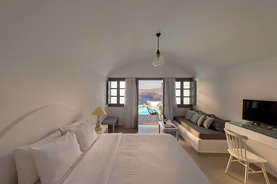 JUNIOR SUITE PRIV POOL CLIFF EDGE CALDERA SEA VIEW is 431 square feet and includes a king-size bed 150-183 width.