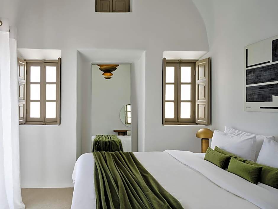 This one-bedroom, at 75m2, provides luxury, comfort and intimacy. The roomy accommodations consists of of a bedroom with walk-in closet and ample bathroom that opens onto the living area. The suite’s private terrace with an infinity heated pool frames an beautiful view of the caldera.
