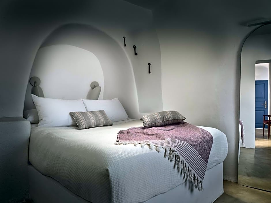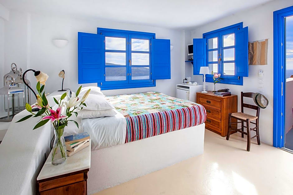 With unique decoration and set-up, this studio has a private veranda overlooking the Caldera and offers unobstructed sea views. It includes a satellite TV. Bedding is by Entos. All studios have Greek bio & Zealots of Nature toiletries, a hairdryer. Slippers are also provided. Please note that this studio cannot accommodate an extra bed.