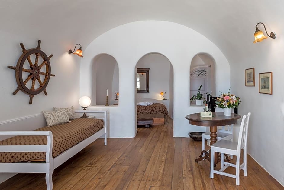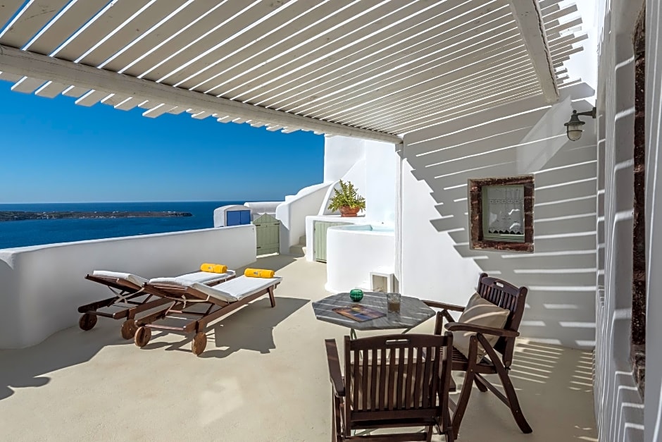Offering a mini outdoor whirlpool, and a furnished, private patio with sea and caldera views, this suite includes 2 bathrooms with shower and Apivita toiletries. It features: -a double bed in the separate, master bedroom -a living room with a built-in sofa bed and a folding double sofa -bathrobes, slippers and pool towels -water, wine, fresh fruit and coffee/tea products are offered upon arrival Please note that this room type can accommodate up to 5 guests.