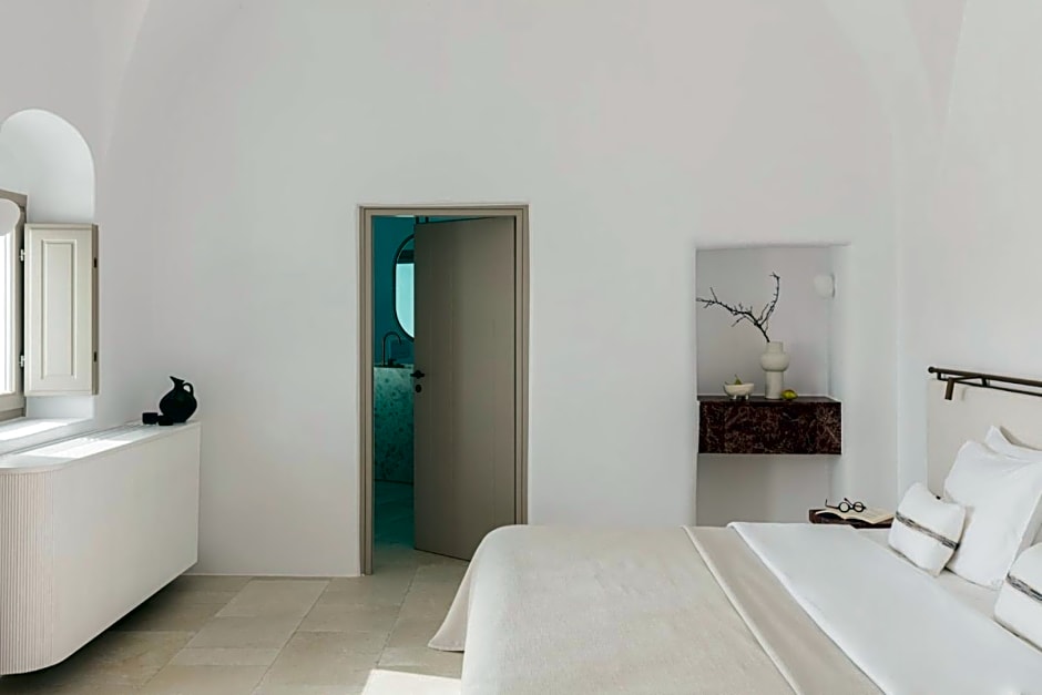 The River pool suite features a magnificent bedroom with separate living room and a bathroom with a rain shower. The highlight of the suite is the river pool plunge pool where you can have your Santorini cave moments and relish the endless views.