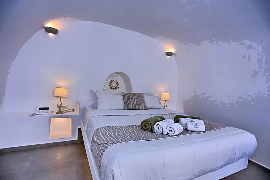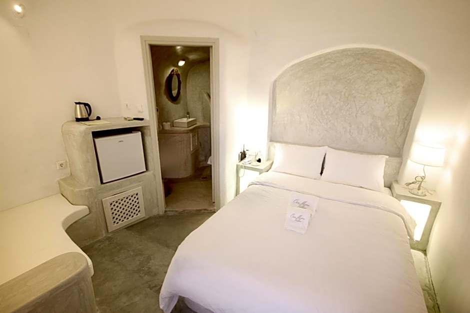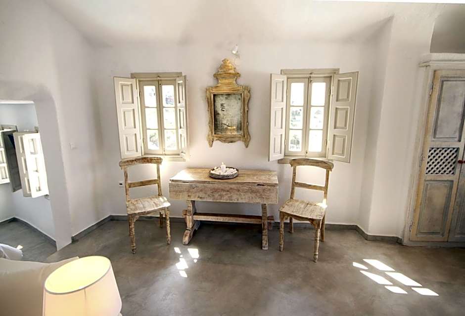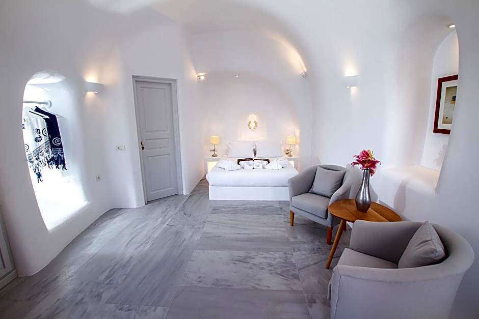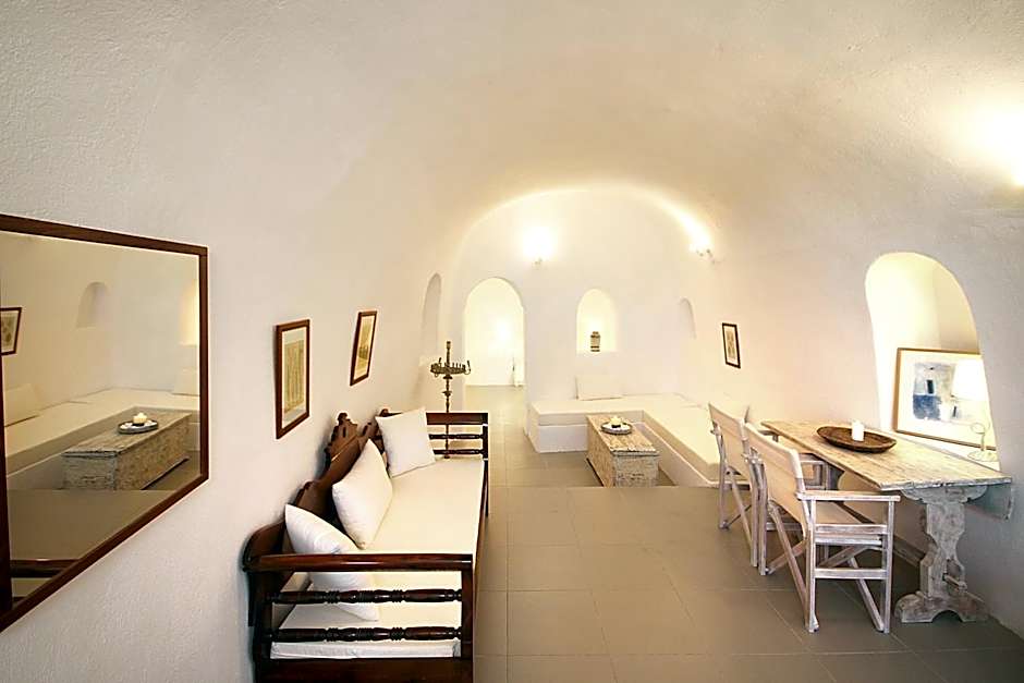 Opening to a private balcony with Aegean Sea and Caldera views, this Cycladic-style suite has a spacious seating and dining area. A sofa bed is included in the room. A flat-screen, satellite TV, mini fridge,safe box , kettle,hairdryer,slippers, pool towels and shower amenities are included free of charge. Air conditioning comes standard.