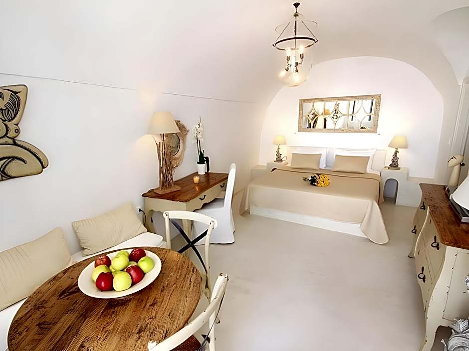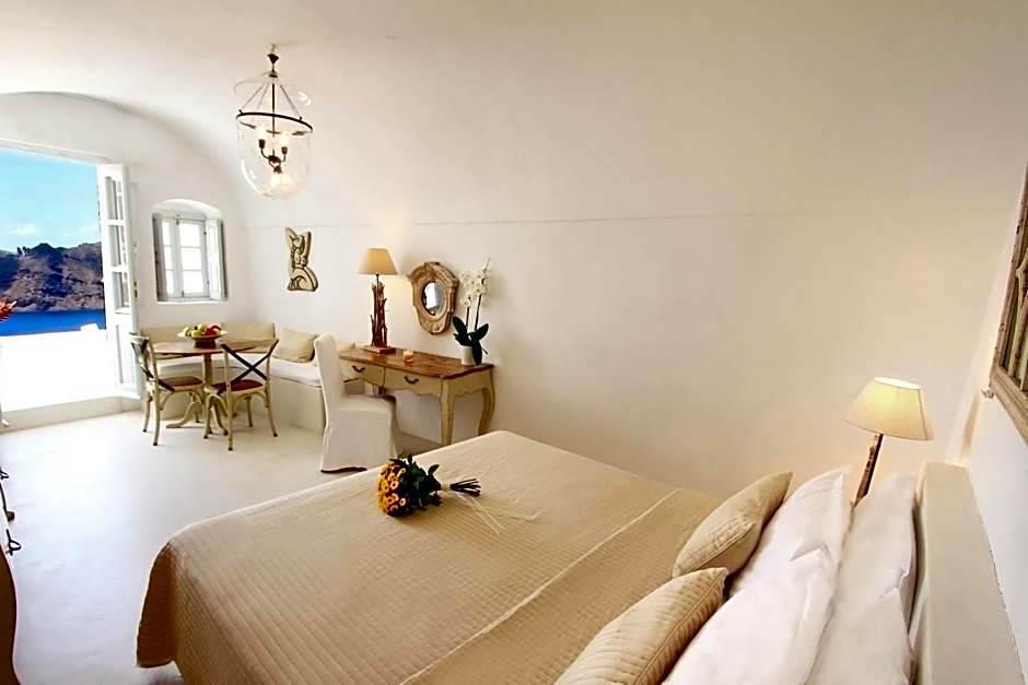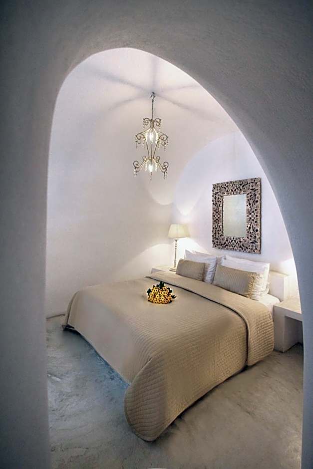 This cave-style room opens to a balcony with a private outdoor hot tub overlooking the sea, the caldera and the volcano.