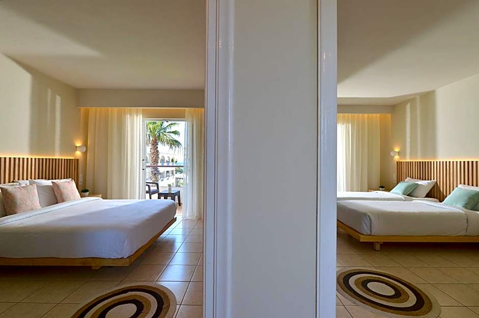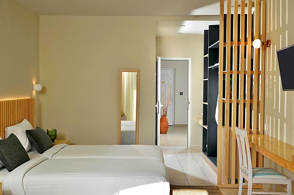 A diverse slate of rooms offers options for different travelers, including Standard Family Studio, Superior, 2 Twin, and Studio with Partial Sea View, as well as Standard, Garden View, and Suite configurations. Many rooms come equipped with air conditioning, balconies, and soundproofing to ensure a comfortable stay as the sea breeze settles in after a day of exploration.