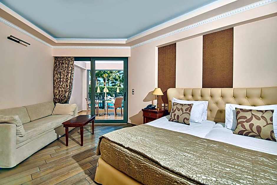Accommodations span a mix of Twin Rooms, Duplex, and Suites, including options like Suite with Partial Sea View and Junior Suites featuring a Pool/Sea View, plus a Swim Up Junior Suite for direct pool access, Attic Suites, and Quadruple Rooms with Sea View. A variety of layouts ensures flexible options for couples and groups seeking different perspectives on the sea.