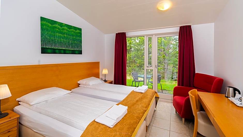 Travelers can choose from a varied slate of rooms at Hótel Eyvindará, from Standard Room (TwinDouble) to Queen Room, with additional options like Cottage, Annex, and Bungalow. Each option is designed to suit different group sizes and itineraries, whether seeking a cozy getaway or more space for a relaxed stay.