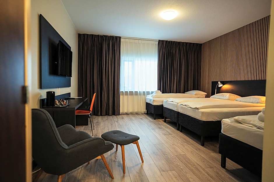 Konvin Hotel by Reykjavik Keflavik Airport offers a variety of room types including Family Rooms, Double or Twin Rooms, Triple Rooms, and Quadruple Rooms. Smoking is not allowed in any of the rooms. The Family Room is the largest with a size of 710 sqft and can accommodate up to 6 adults and 3 children. The other room types have a size of 355 sqft and accommodate varying numbers of adults and children.
