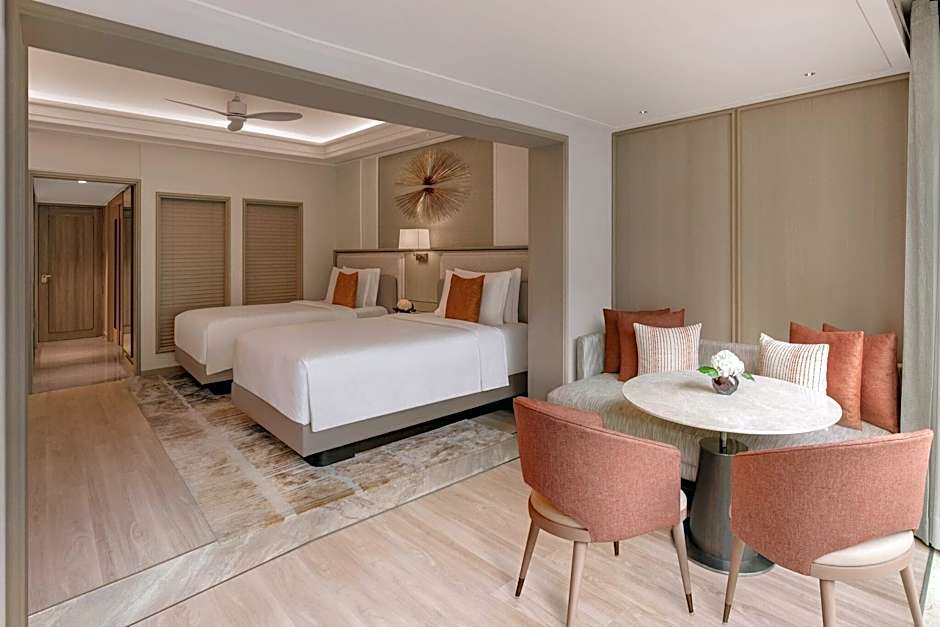 The St Regis Goa Resort offers a variety of rooms including Twin, Double, Suite, and Villa options. The rooms feature either lagoon or golf views, and range in size from 517 sqft to 2422 sqft. All rooms are non-smoking and can accommodate 2 adults and 1 child, except for the larger suites and villa which can accommodate up to 3 adults and 2 children. The beds available are either twin beds or king size beds.