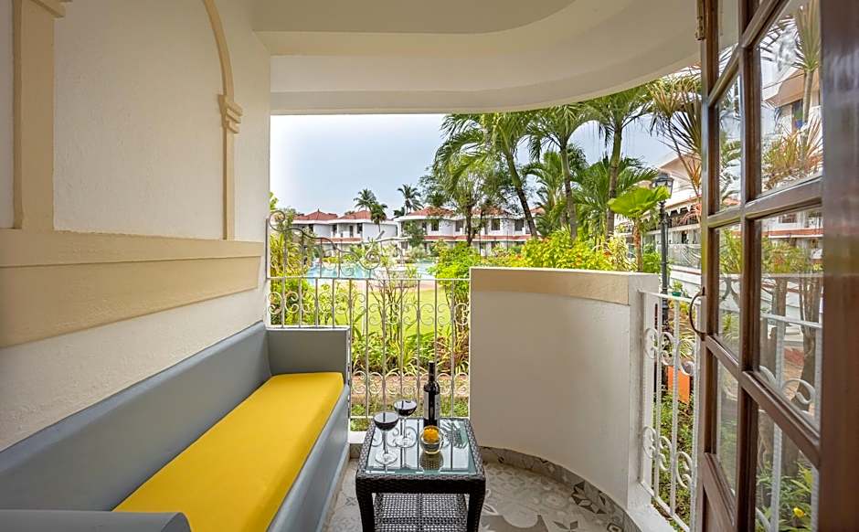 Goa Velha’s coastal retreat blends spa luxury with outdoor leisure. Spa/Wellness packages invite rejuvenation, and an outdoor swimming pool offers a scenic view for lazy afternoons. An adults-only pool adds a quiet option for sun-seekers, while a garden-view setting provides a calming backdrop. Beach access is right at hand, and evenings come alive with free live music performances and a welcoming bar.