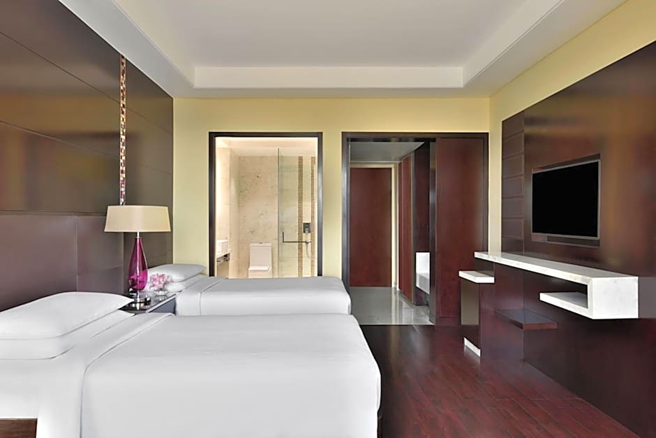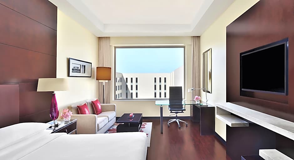 Experience the comfort of the well-appointed rooms at the Jaipur Marriott Hotel. Whether you choose the Deluxe Suite, Executive Twin Room, Deluxe King Room, Deluxe Twin Room, or Executive King Room, you'll enjoy a relaxing and cozy atmosphere. With spacious accommodations, modern amenities, and luxurious furnishings, each room provides a perfect sanctuary after a day of exploration. Plus, guests in the Executive rooms can revel in complimentary cocktails at Lounge 18 from 6 pm to 8 pm, as well as a two-way airport transfer, adding a touch of luxury to their stay.