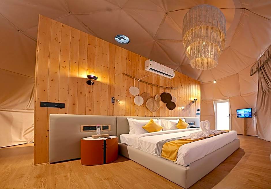The hot tub and spa bath are the standout features of this tent. This air-conditioned tent is consisted of of a flat-screen TV with streaming services, a private bathroom as well as a balcony with garden views. The unit has 2 beds.