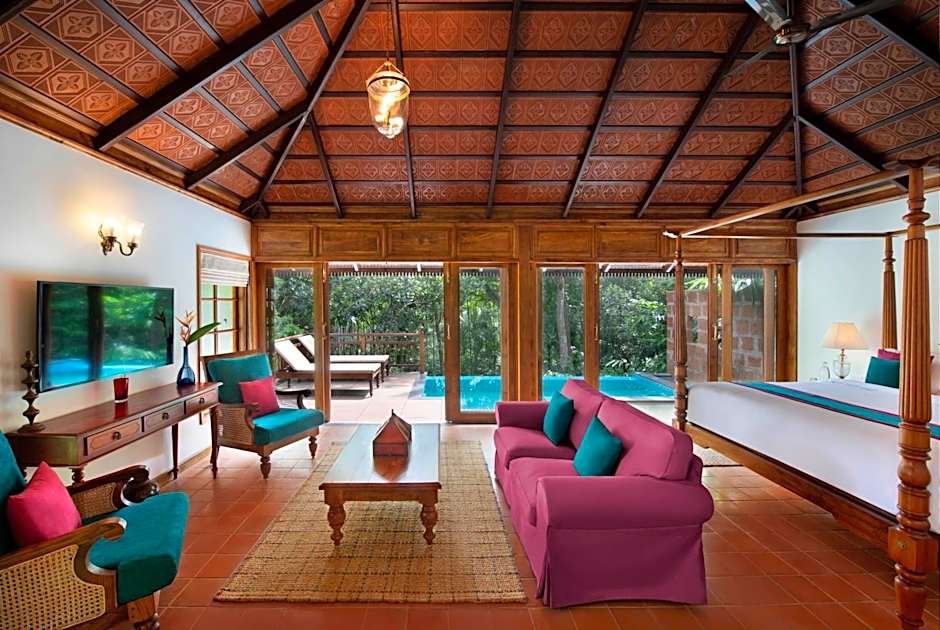 The heritage pool villas come with a private garden, private infinity plunge pool and endless views of the plantation. The large bathroom is open to a lush garden courtyard (via glass doors) and offers twin vanities and a free-standing bath tub. Crafted from the local laterite rock in the traditional architectural style, these villas have been designed to offer guests a private holiday experience cocooned in every conceivable luxury. This room has a controlled heating pool.