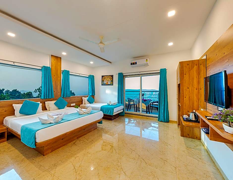 A range of room options covers Deluxe, Deluxe with Balcony, Super Deluxe with Balcony, Premium with Balcony, Executive Balcony, Family, Mountain View variants, and more. All rooms are non-smoking, air-conditioned, feature a private entrance, and have extra-long beds. Most configurations accommodate two adults and one child, with some layouts designed for larger groups, and room sizes range from about 130 sqft to 862 sqft.