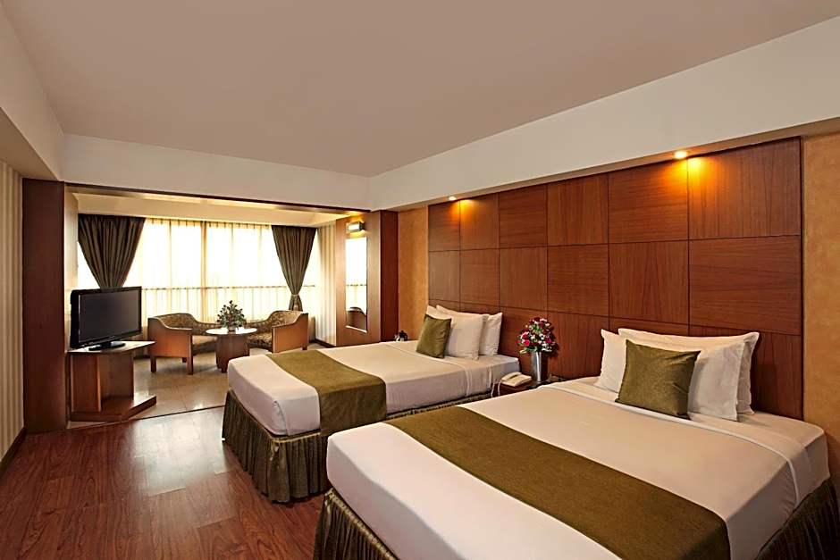 Hotel Aurora Towers offers Deluxe rooms with 1 King bed and Executive rooms with 2 beds. Both room types do not allow smoking and can accommodate 2 adults and 1 child. Bed sizes are confirmed for the Executive room only, and the bed sizes for the Deluxe rooms are not provided.