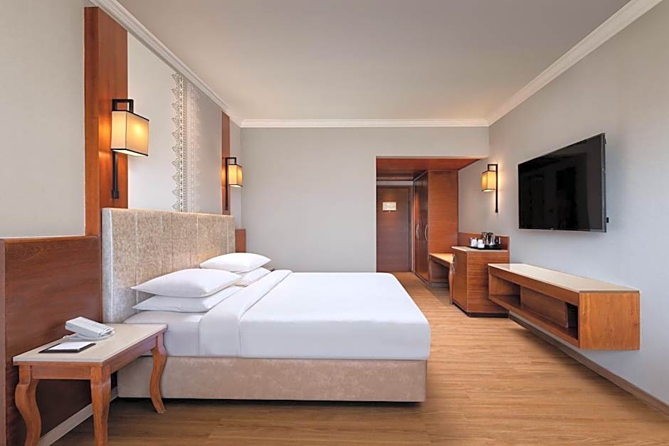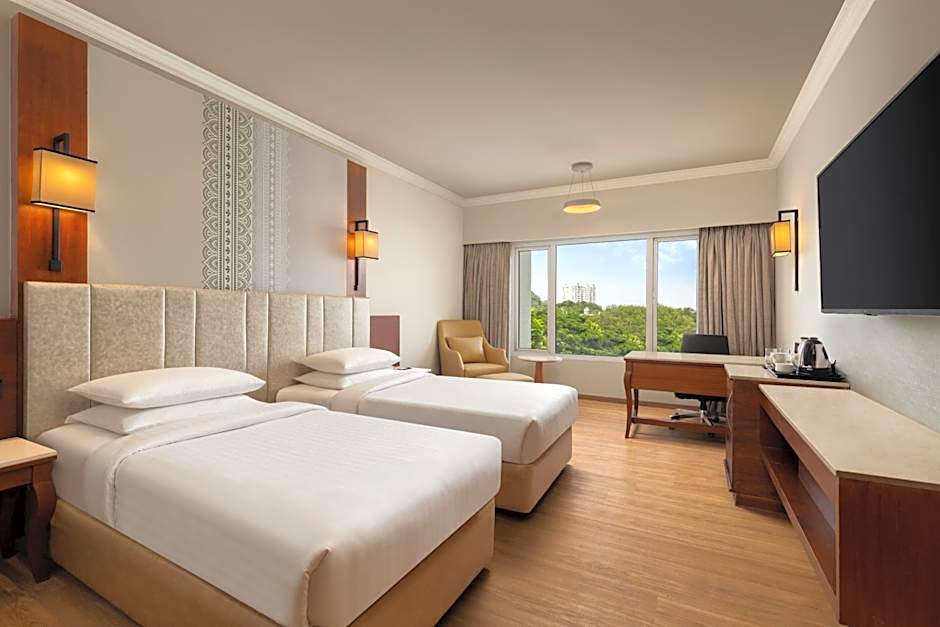 The Courtyard by Marriott Tiruchirappalli offers a variety of room options, including Twin Rooms with City Views, Junior King Suites, King Rooms with City Views, Premium King Rooms with City Views, and Premium Twin Rooms. All rooms are non-smoking and can accommodate up to 3 adults and 1 child. The Twin Rooms have 2 twin beds, while the other room types have 1 king-size bed. The sizes of the rooms range from 269 sqft to 667 sqft.