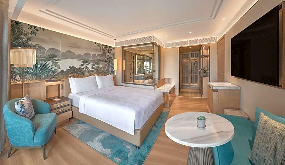 The hotel offers a variety of room types including Luxury King Room with Balcony and Bay View, Luxury King Room with Balcony and Courtyard View, Luxury Twin Room with Balcony and Courtyard View, Luxury Tropical King Room with Balcony and Forest View, and Luxury Tropical Twin Room with Balcony and Forest View. All rooms have a size of 377 sqft and do not allow smoking. The rooms can accommodate up to 3 adults and 1 child, with bed options of 1 King size bed or 2 Twin beds.