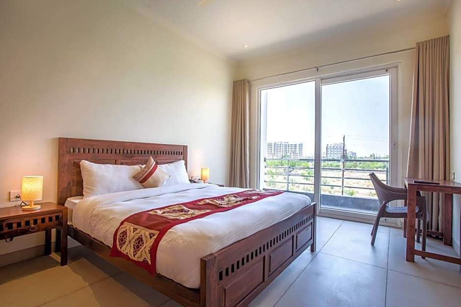 The types of rooms available at Hotel: The Vrindwoods include King Rooms, Deluxe Double Rooms with Balcony, Junior Suites with Pool View, and Deluxe Rooms (2 Adults + 1 Child). The rooms can accommodate 2 adults and 1 child, and smoking is not allowed in any of the rooms. The bed size in all the rooms is a Queen size bed, and the room sizes range from 172 sqft to 291 sqft.