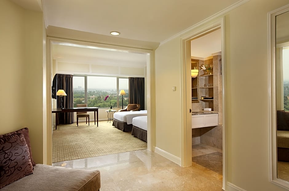 Hotel Aryaduta Bandung offers various room types including Business Double or Twin Rooms, Aryaduta Suites, Deluxe Double or Twin Rooms, and Aryaduta Executive Suites. These rooms accommodate 2 adults and 1 child, with bed sizes ranging from Queen to King and Twin beds. All rooms are non-smoking and vary in size from 366 sqft to 1055 sqft.