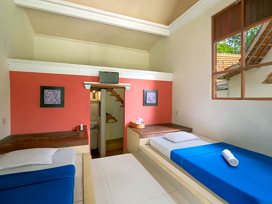 Cozy triple room with 3 twin beds, air conditioning, bathtub, and a lovely garden view. Perfect for 2 adults and 1 child to enjoy a relaxing stay.