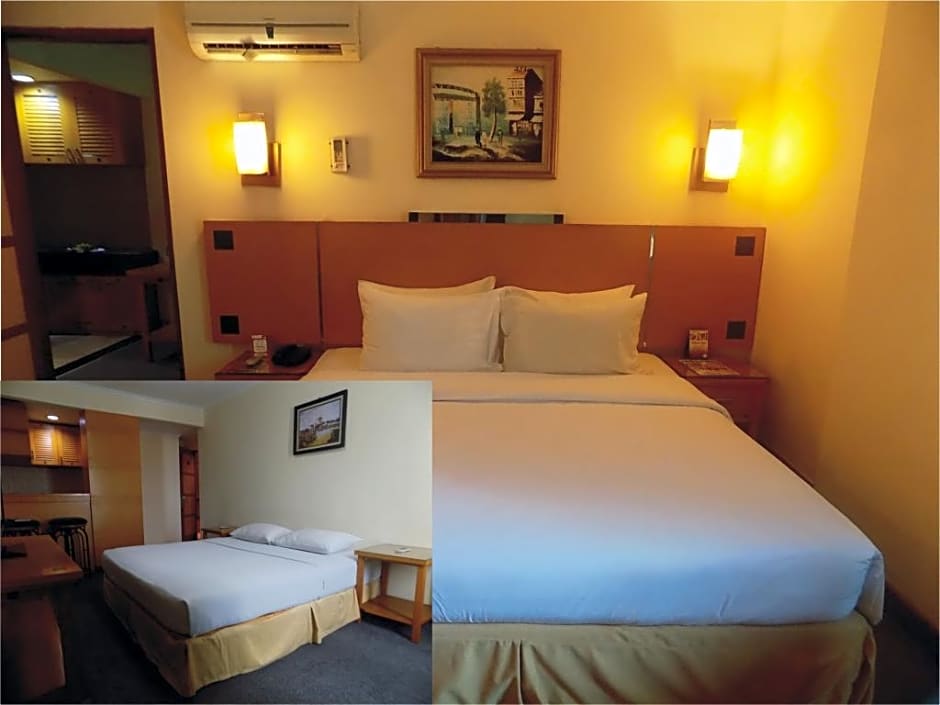 At Mega Anggrek Hotel Jakarta Slipi, room options include Deluxe Double Rooms with a King size bed for 2 adults, and Family Rooms with a King size and Queen size bed for 4 adults. All rooms are non-smoking with different bed configurations, accommodating up to 2 adults and 1 child. Additionally, there are Superior Double or Twin Rooms available featuring 2 Twin beds and a King size bed.