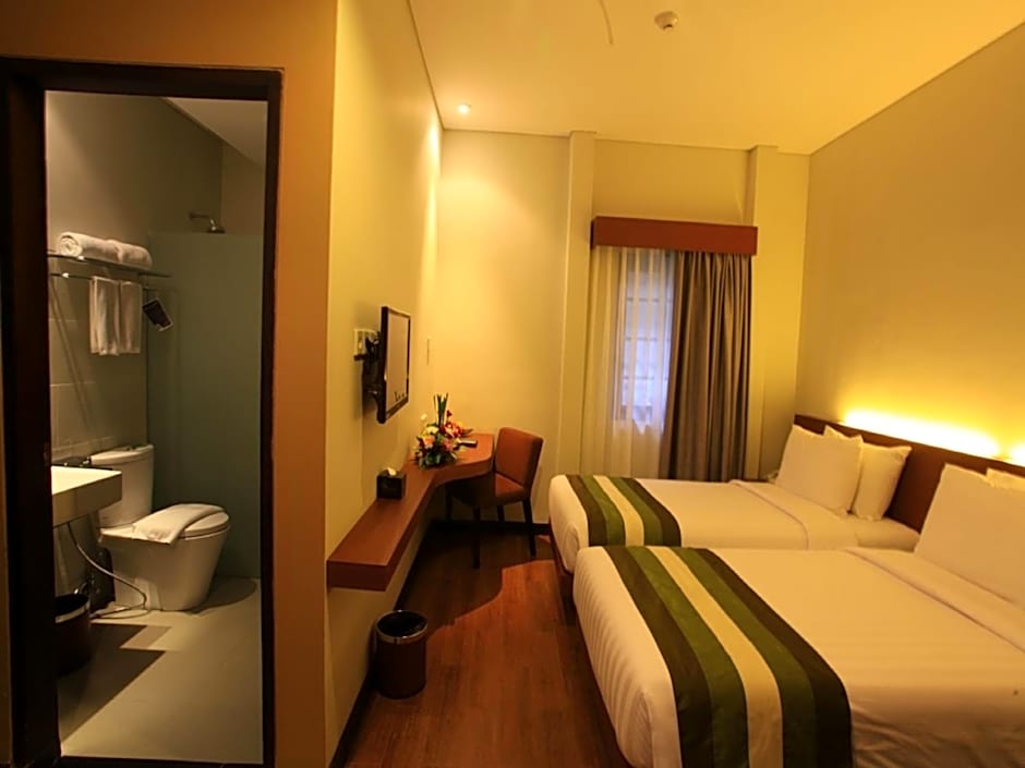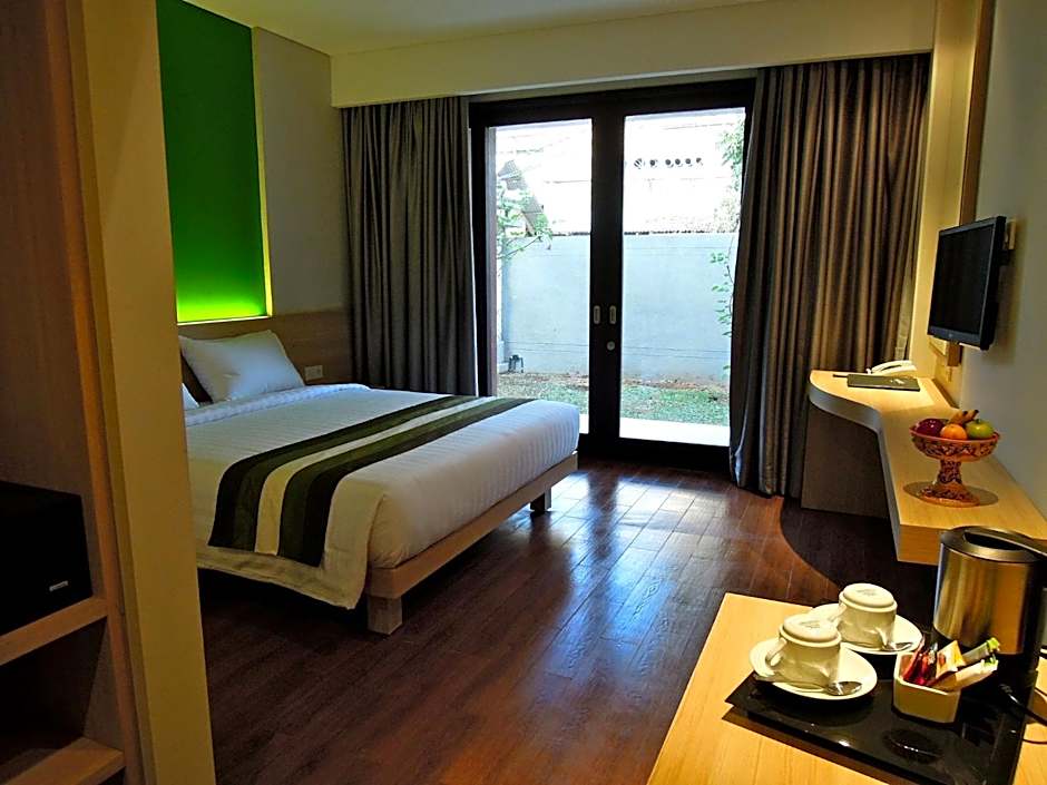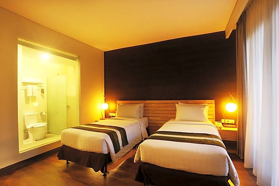 The Grand Whiz Hotel Nusa Dua Bali offers a variety of room types including Premier Double or Twin Rooms, Double Rooms, Superior Double or Twin Rooms, and Deluxe Double or Twin Rooms. All rooms are non-smoking and can accommodate 2 adults and 1 child. Bed sizes include twin beds and king-size beds. Room sizes range from 258 square feet to 377 square feet.