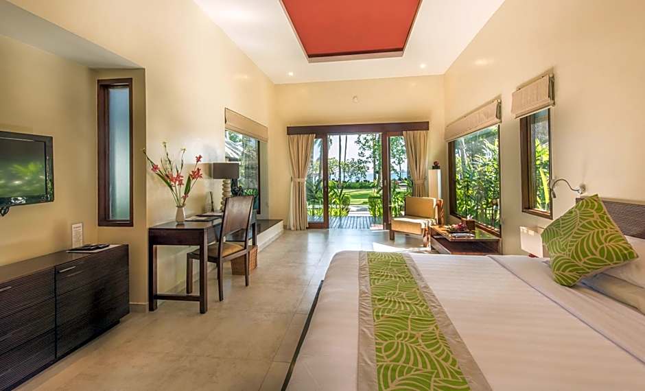 The Chandi Boutique Resort & Spa offers spacious Executive Garden View Villas and Ocean View Villas. Both room types are non-smoking and can accommodate 2 adults and 1 child. The Executive Garden View Villa has a larger room size of 700 sqft, while the Ocean View Villa has a room size of 484 sqft. Both room types come with a comfortable King size bed.