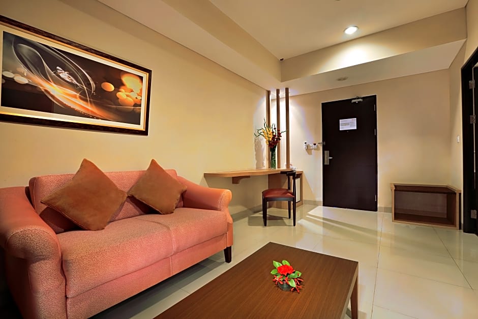 The hotel has an on-site restaurant called Bianco Sapori D'Italia. The restaurant offers a mix of cuisines including Indonesian, Italian, and International dishes, and has ambiances suitable for families, couples, and modern settings.