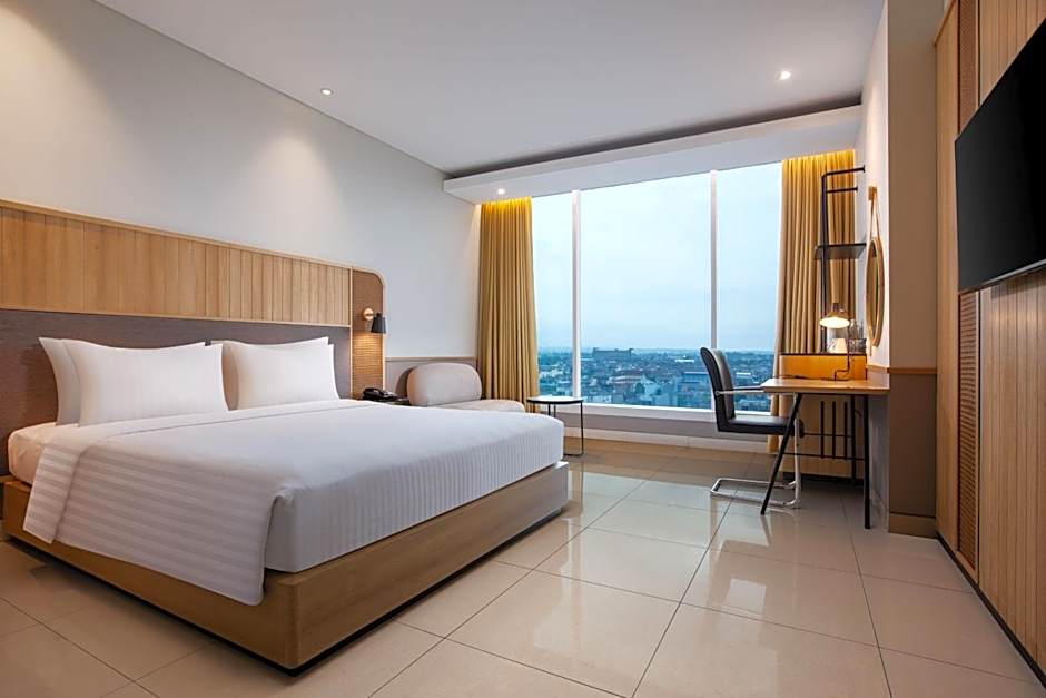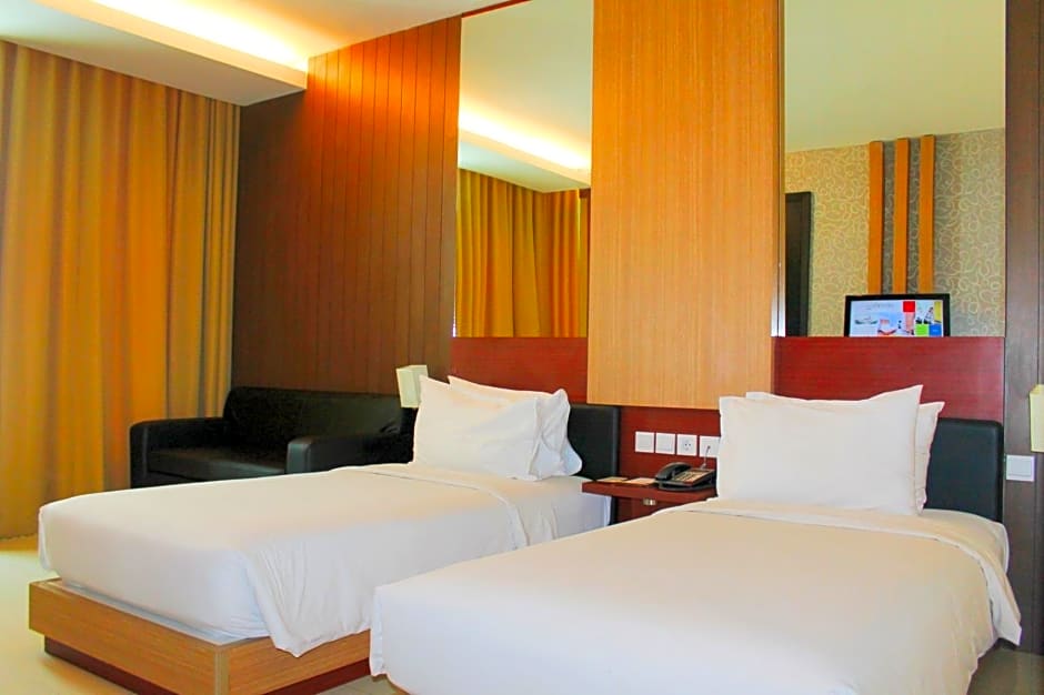 Hotel Santika Tasikmalaya offers Superior King and Twin Rooms along with Deluxe Rooms in both double and twin configurations. The rooms are smoke-free with an occupancy option for 2 adults and 1 child. Bed sizes range from a Queen size bed in the Superior King Room to Twin beds in the Twin Rooms. The room sizes vary between 258 sqft and 301 sqft.
