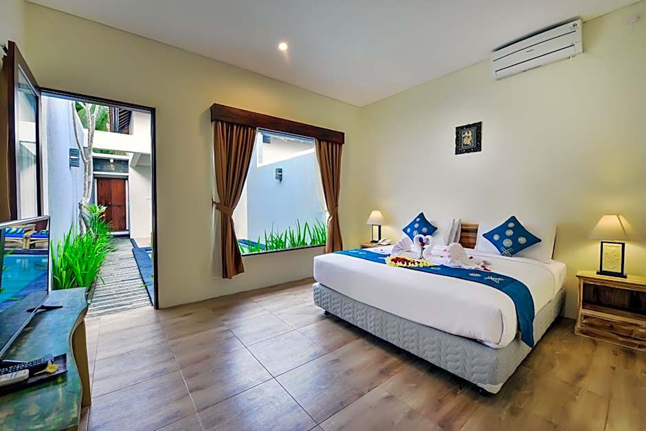 This villa features a private pool, an open plan seating and dining area, an air-conditioned bedroom and an private bathroom.