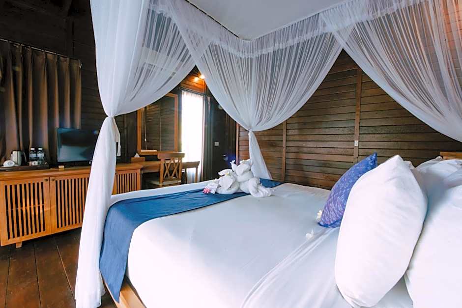 GARDEN JOGLO VILLA is 377 square feet and includes a queen-size bed 150-154 width plus balcony, desk, satellite tv , and cable tv.