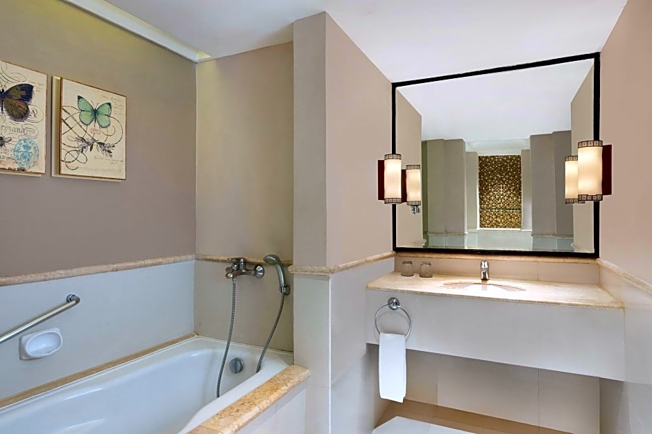 The Sheraton Mustika Yogyakarta Resort and Spa offers various types of rooms, including Junior Suite, Deluxe Twin, Deluxe King, Grand Deluxe King, Grand Deluxe Twin, and Lagoon Access Room. All rooms have balconies and are non-smoking. The rooms are double occupancy and can accommodate up to 3 adults and 1 child. The bed size in all rooms is a King size bed.