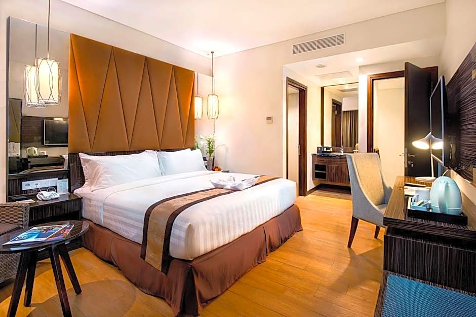 The Atrium Hotel & Resort Yogyakarta offers three types of rooms: Executive Suite, Deluxe Twin Room, and Deluxe Double Room. The Executive Suite is a spacious suite with a size of 603 sqft, suitable for 2 adults and 2 children. Smoking is not allowed in any of these rooms. The Deluxe Twin Room and Deluxe Double Room both have a size of 301 sqft and can accommodate 2 adults and 2 children. The Deluxe Twin Room has 2 twin beds while the Deluxe Double Room has 1 king-size bed.