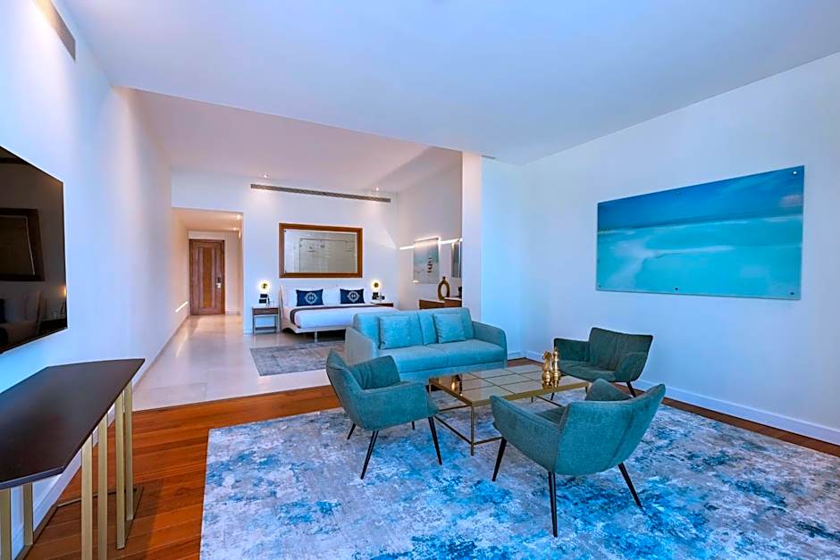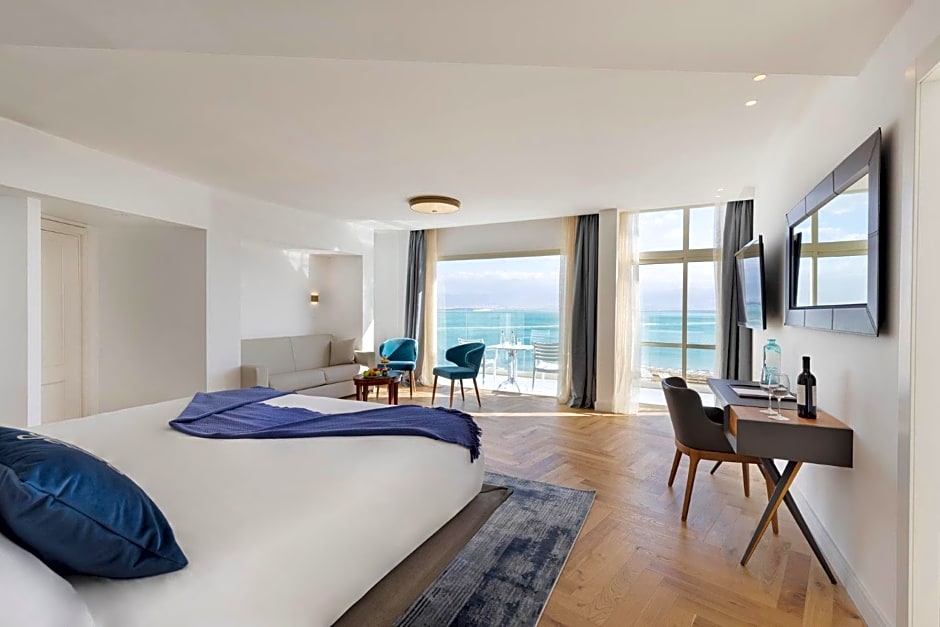 Air-conditioned room featuring a balcony with sea views and a seating area with a flat-screen satellite TV. Amenities include a mini-bar, a safe and an electric kettle. The bathroom comes with a spa bath.