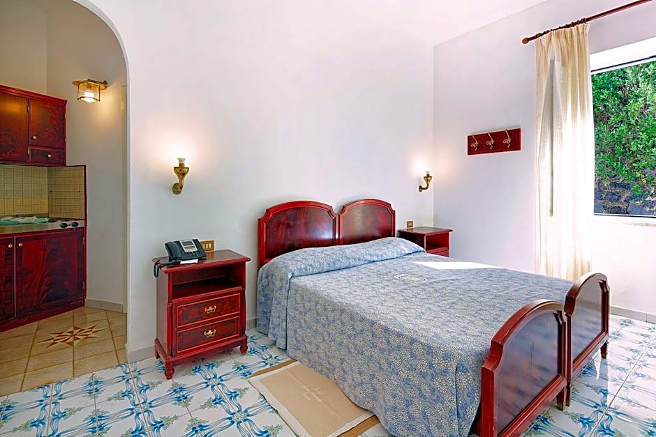 Accommodations come in several apartment and studio configurations with sea or garden views, all non-smoking and suitable for up to 2 adults and 1 child. Options include Studio Apartment, Sea View; Standard Studio, Sea View; Apartment, 1 Bedroom; Superior Apartment, 1 Bedroom, Garden View; and Apartment, 1 Bedroom, Sea View. Cash and major cards (American Express, Visa, Mastercard, Maestro, CartaSi) are accepted for payment. The address is Via Maronti, Ischia, Italy.