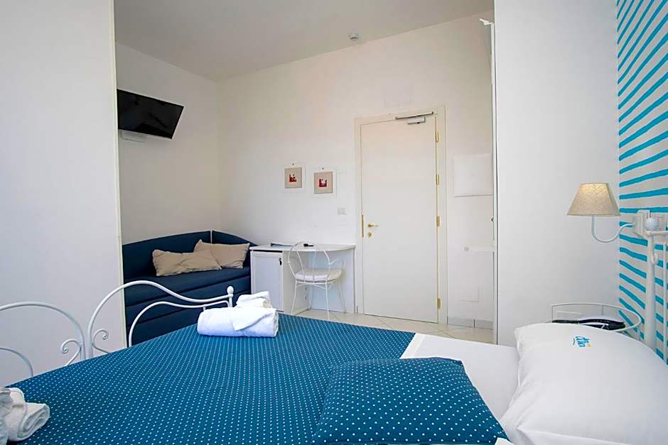 Hotel Calanca offers a Quadruple Room with Direct Sea View, accommodating 2 adults and 1 child. This room does not allow smoking and features a Queen size bed, with a room size of 172 sqft.