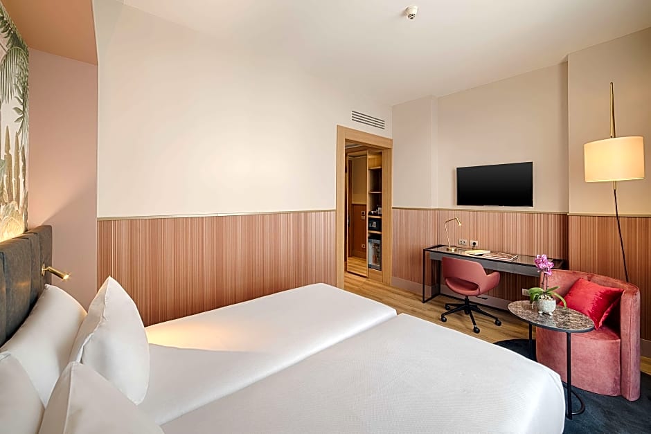 NH Collection Milano Touring offers a variety of room types including Suites, Deluxes, Premiums, Superior Doubles or Twins, and Singles. Smoking is not allowed in any of the rooms. The rooms can accommodate between 1 and 3 adults and include bed sizes such as double, queen, king, and twin. The sizes of the rooms range from 129 sqft to 301 sqft.