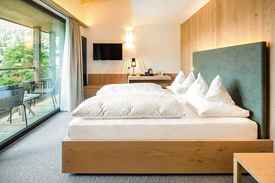 This elegant room has contemporary décor, carpeted floors and a balcony complete with table and chairs. Some rooms feature a glass wall dividing the room from the bathroom. Some rooms overlook the ski slopes, others face the garden.