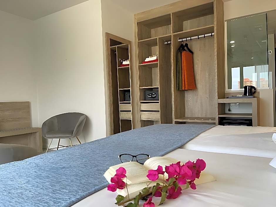 A selection of room styles provides flexible options, including a Double Room (269 square feet) with a Queen bed, a Quadruple Room (377 square feet) with two twins and a Queen, and a Suite with Terrace (484 square feet). A Studio Economy and other layouts round out the choices for different travel needs.