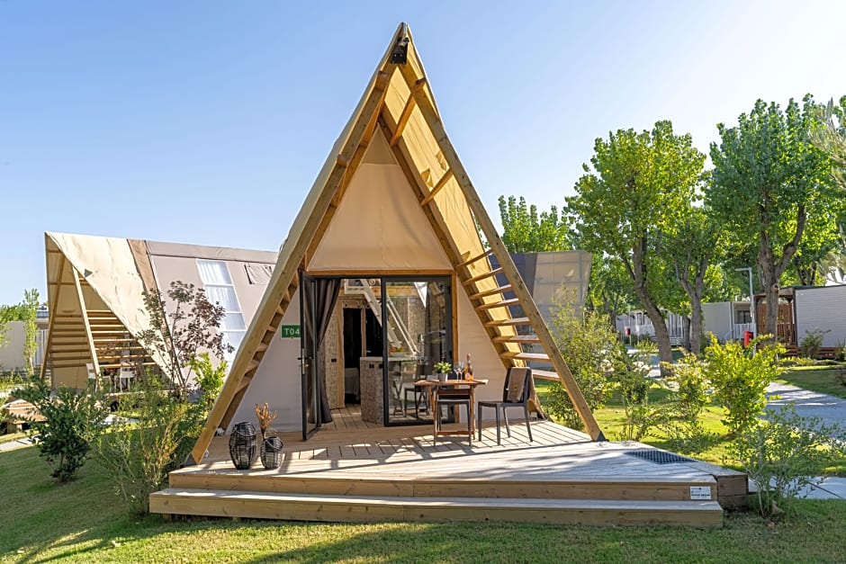 Lodge Deluxe is 377 square feet and includes either 2 single beds 80-130 width, bunk beds, or a double bed 131-150 width plus terrace, hairdryer, and safe.