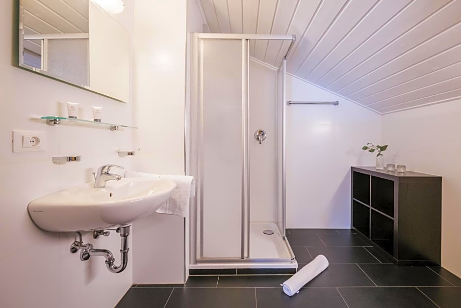 This Family room has a high-quality mattresses, dark wood floors, furniture in light spruce wood, bunk beds (normal size) for children, flat TV with satellite connection, free W-LAN with connection to daily press, safe and telephone. Bathroom furnishings: large bathroom with shower, WC, bidet, mirror for cosmetic purposes, hair dryer, high-quality towels and toiletry products