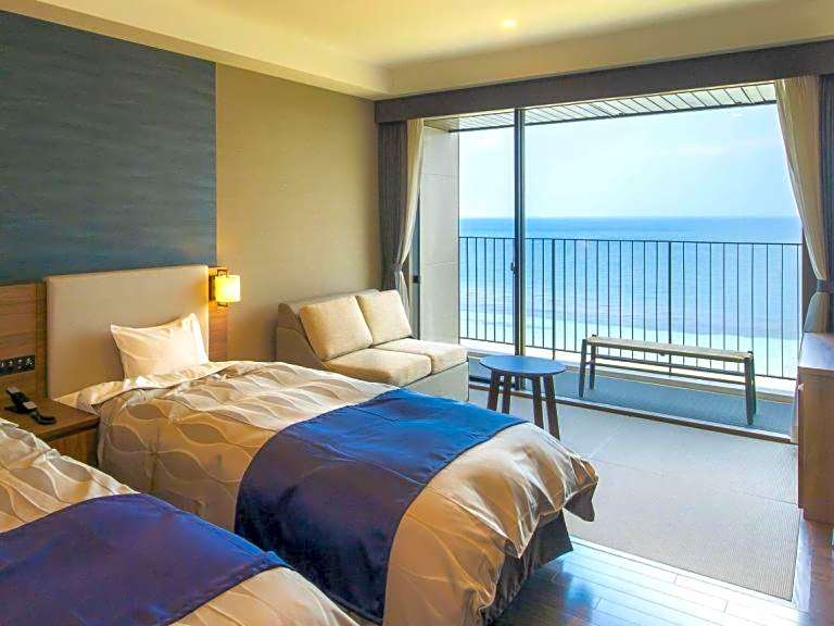 The hotel offers a range of rooms including Superior Twin Rooms and Standard Twin Rooms with sea views, accommodating up to 3 adults and 2 children. Additionally, there are Family Rooms and Royal Family Rooms, both with sea views, accommodating 4 adults and 2 children, featuring Twin beds and Futon Mats. Smoking is not allowed in any of the rooms. The room sizes are not explicitly provided.