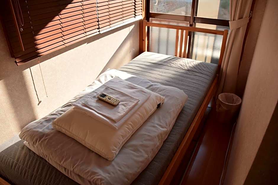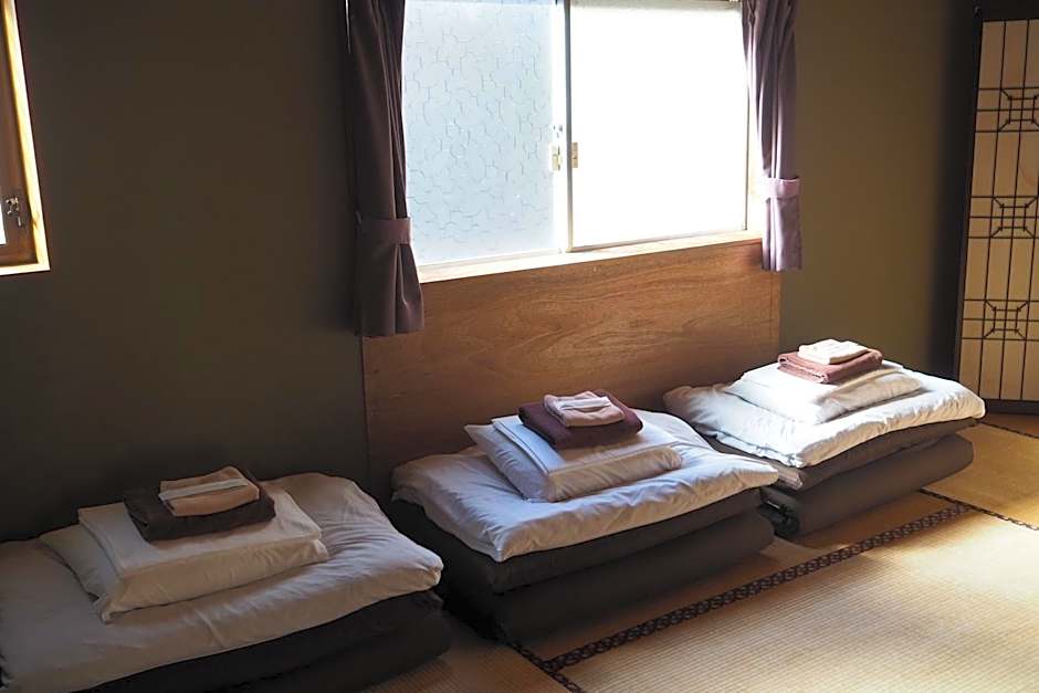 This Japanese-style triple room features air conditioning, tatami (woven-straw) flooring and futon mattresses. Bathroom and toilet facilities are shared. Room is located on 2nd floor and can be reached only via stairs.