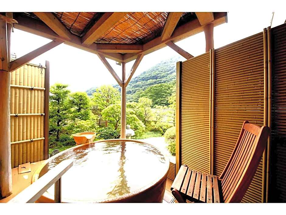 The private open-air bath is a top feature of this twin room. The twin room includes a private bathroom, well-fitted with a bath, a shower, a bidet, a hairdryer and slippers. The air-conditioned twin room features a flat-screen TV, tatami, a tea and coffee maker and yukata.