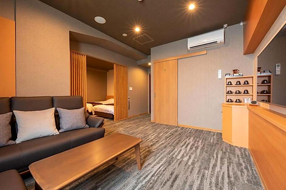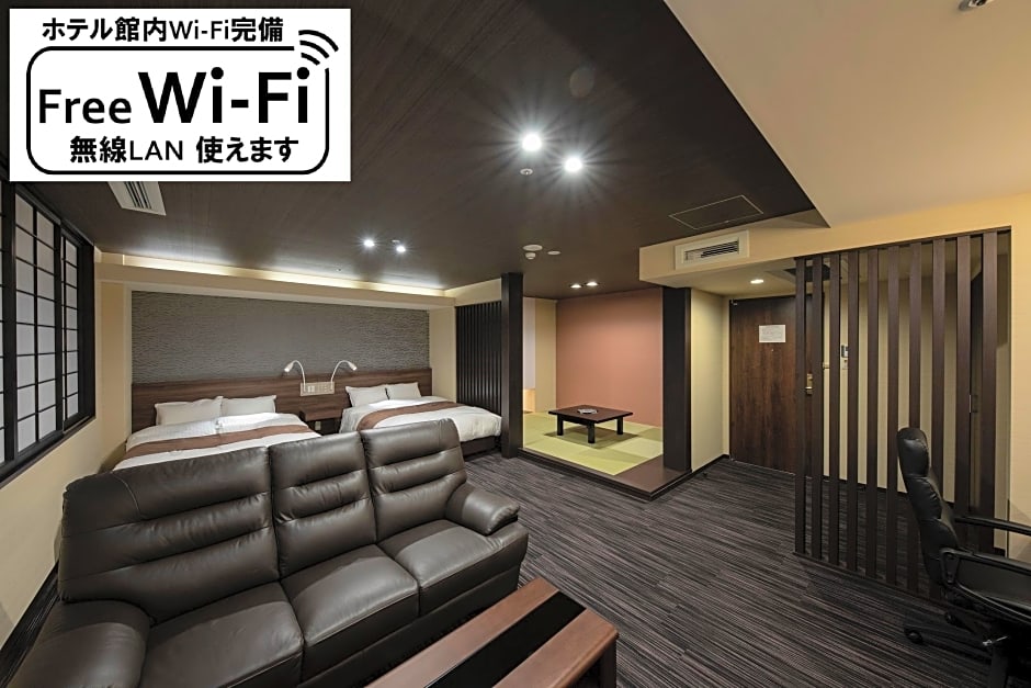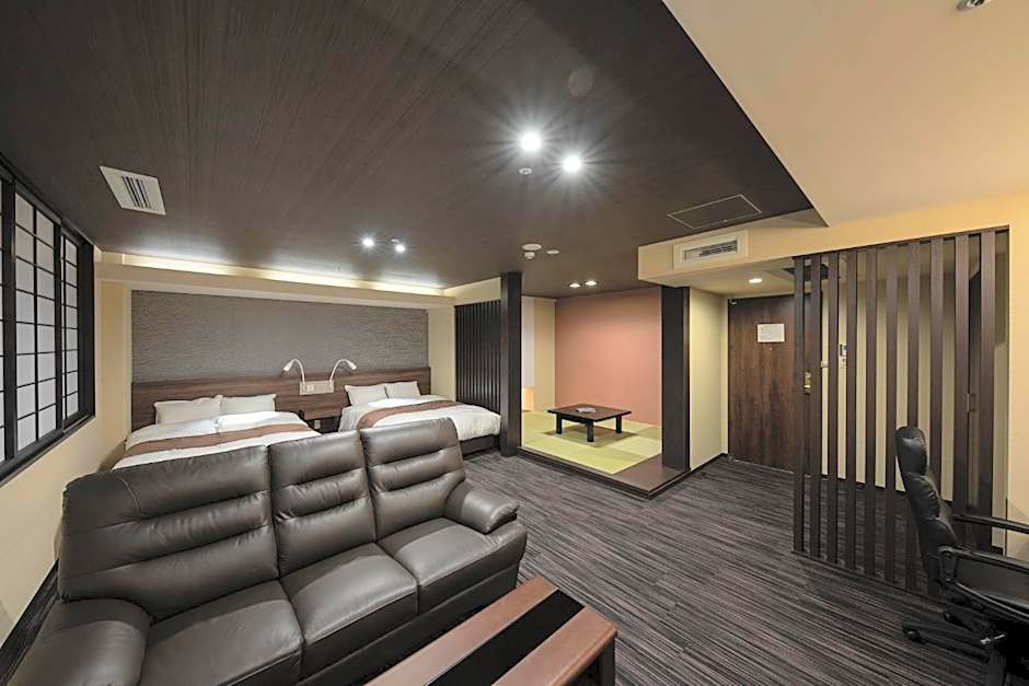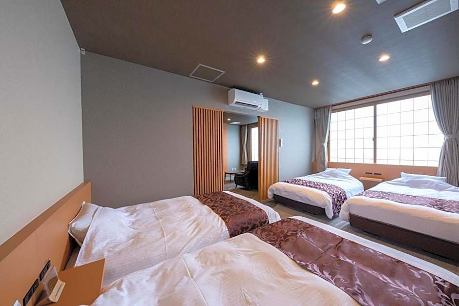 The quadruple room offers air conditioning, a seating area as well as a private bathroom featuring a bath and a shower. The quadruple room provides a safe deposit box, an electric kettle, a sofa, yukata, as well as a flat-screen TV. The unit offers 2 beds and 2 futon beds.