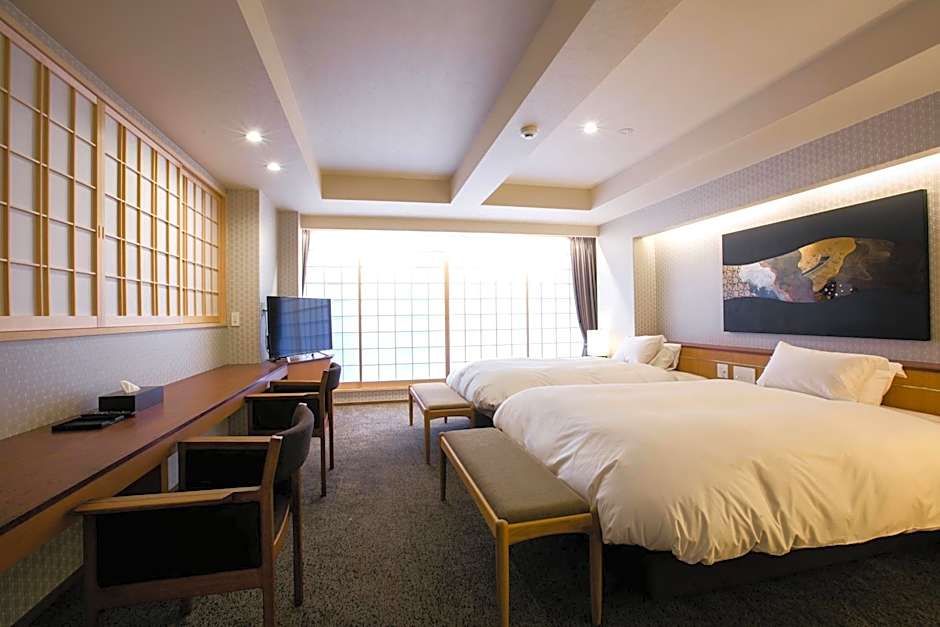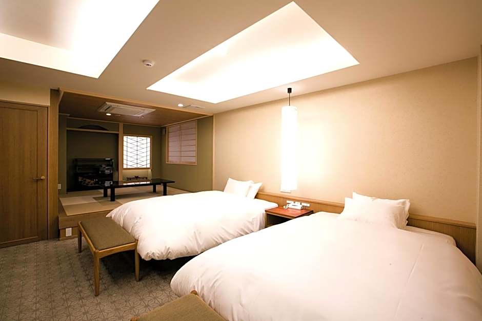 At the Kyoto Kamanza Hotel, the rooms available include the Deluxe Twin Room, Large Twin Room, and Suite. The Deluxe Twin Room is a twin room with a size of 334 sqft, accommodating 2 adults and 1 child. The Large Twin Room is also a twin room, but larger at 344 sqft, accommodating 3 adults and 2 children. The Suite is the largest room at 678 sqft, accommodating 4 adults and 2 children with a combination of futon mat and double beds. Smoking is not allowed in any of the rooms.
