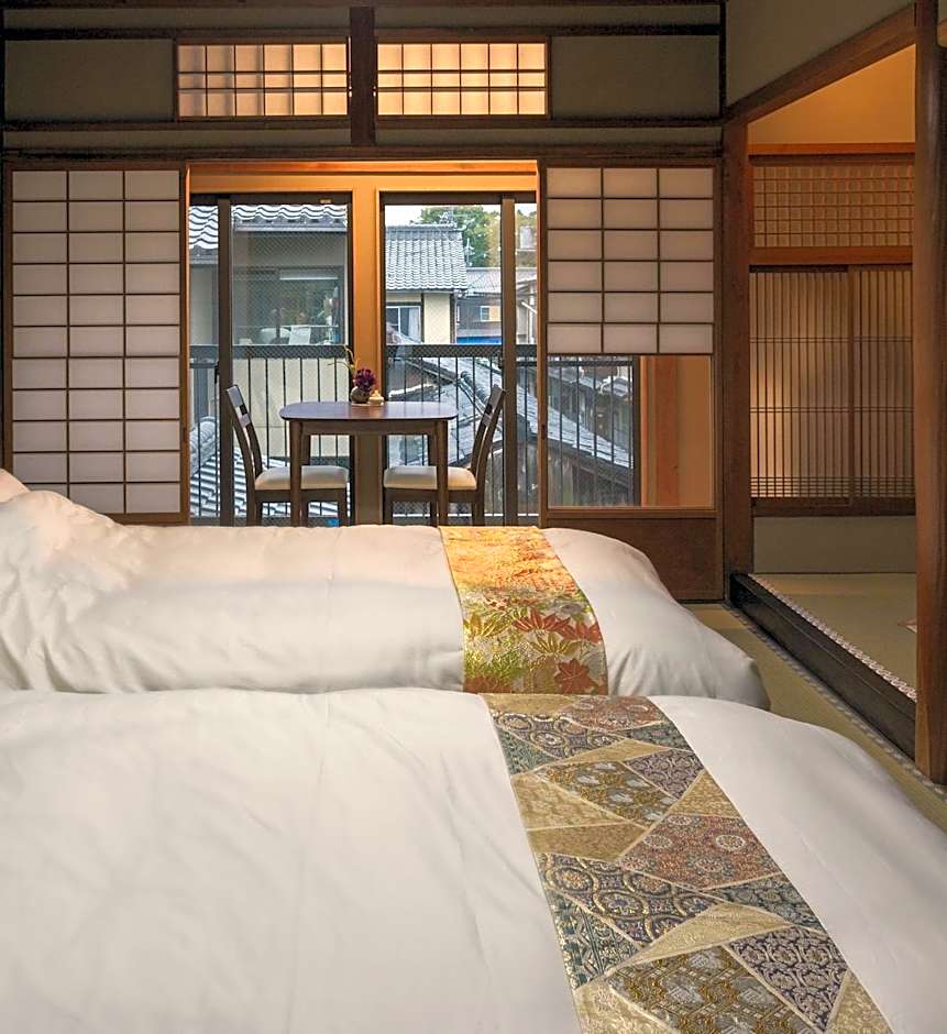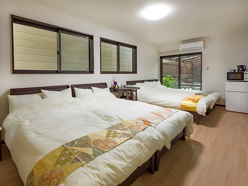 The quadruple room includes a private bathroom, well-fitted with a walk-in shower, a bath, a bidet, a hairdryer and slippers. The quadruple room is furnished with a desk and a seating area and provides air conditioning, tatami and garden views. The unit offers 3 beds and 1 futon.