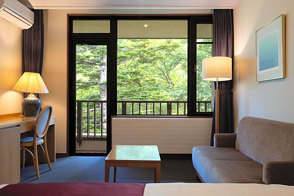 This twin room features a sofa, air conditioning and DVD player. The large window and the balcony features views of the forest.