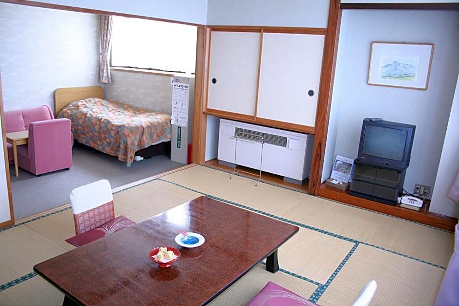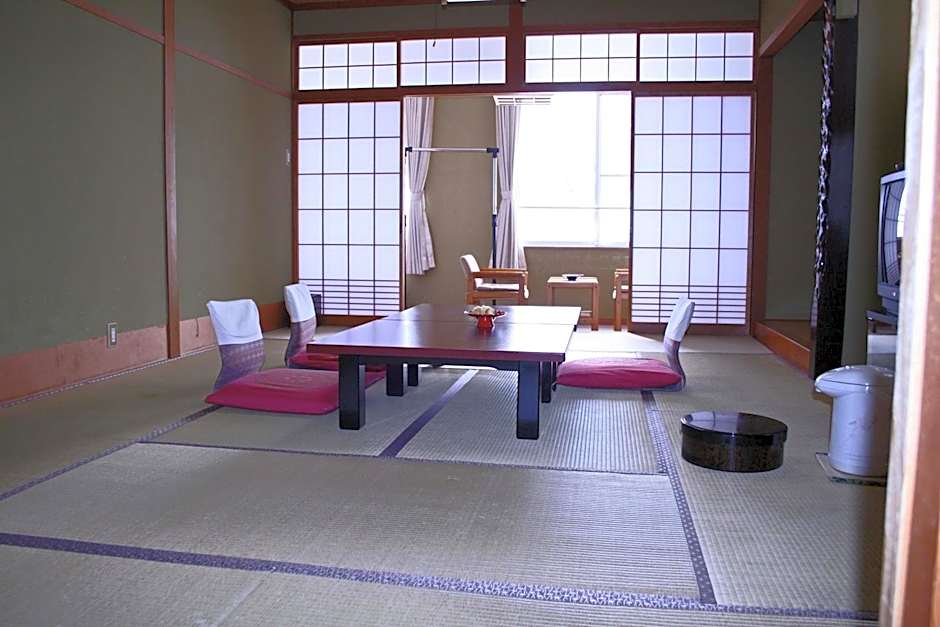 The quadruple room offers air conditioning and tatami, as well as a shared bathroom featuring slippers. The quadruple room comes with a flat-screen TV, an electric kettle, yukata, as well as heating. The unit offers 5 futons.